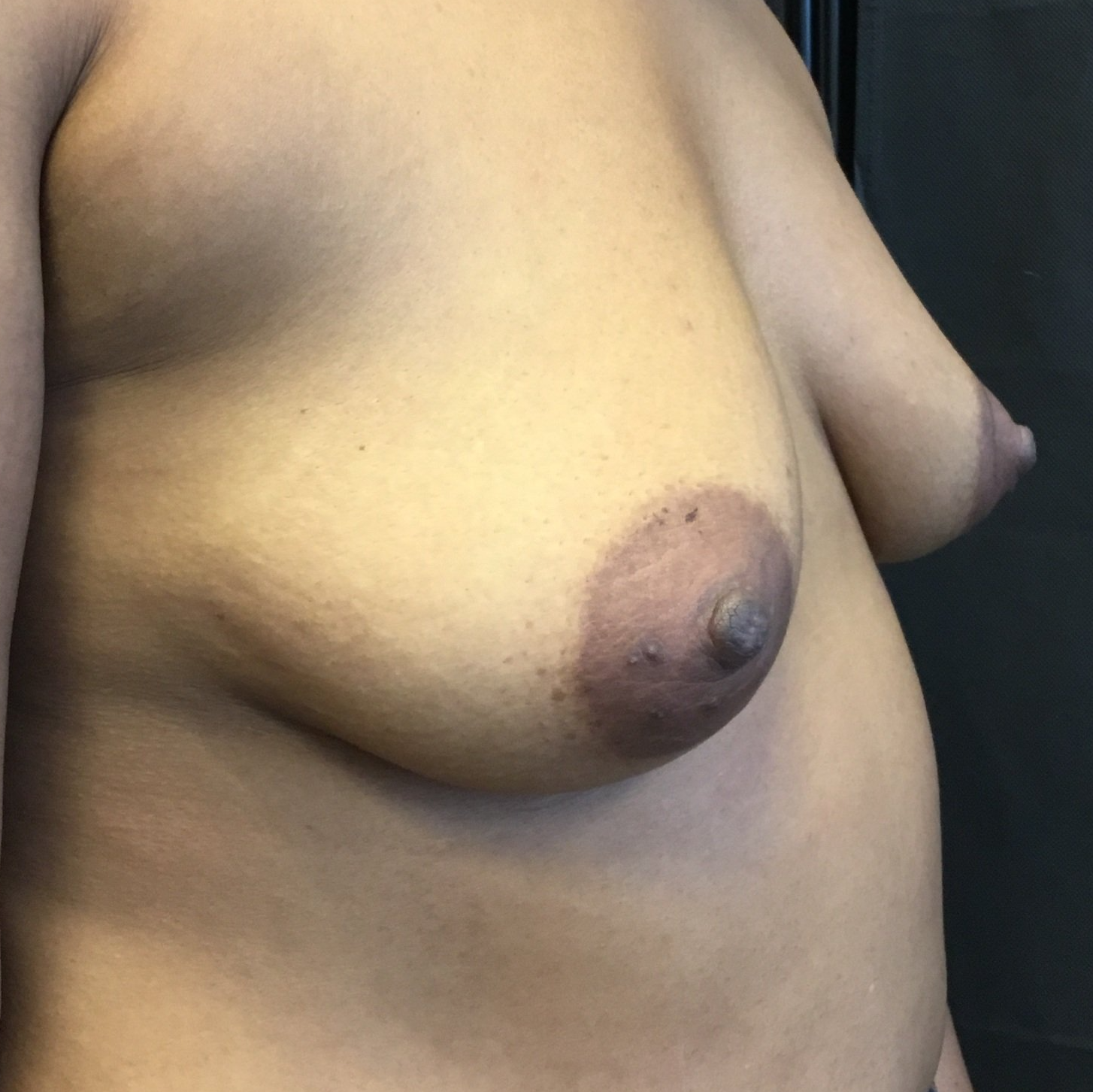 Links de situatie voor de operatie. De borst heeft de neiging te gaan hangen. Rechts: plaatsing van een prothese voor de borstspier zonder lift.